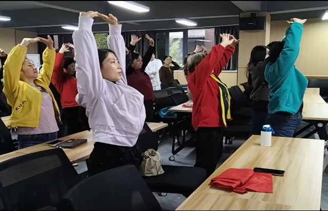 活动尾声,志愿者们带领社区居民一起学习“八段锦”养生操,现场互动热烈,气氛活跃。同时,义务为社区居民测量血压,提供咨询服务。同学们的认真和热情,得到了社区居民的高度认可。