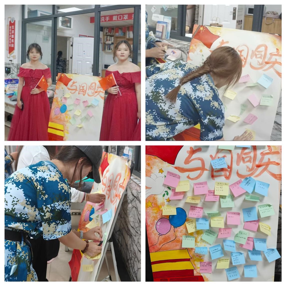 学院在一站式学生社区设置手绘展板,寄语如潮,字字句句都饱含着同学们对祖国的深情厚爱。这些寄语,不仅是对祖国75周年诞辰的庆祝,更是对青年一代的激励和鞭策,提醒着每一位青年医护学子,要时刻保持对祖国的热爱和忠诚,用自己的实际行动为祖国的繁荣与发展贡献自己的力量。