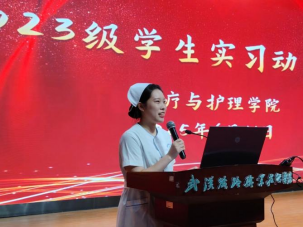 随后,2023级学生代表向楼堰分享感悟。她结合自身学习经历,生动诠释实习的价值与意义,鼓励同学们以积极热忱的态度投身实习,把握实践机遇,在临床一线积累经验、突破自我,激励同学们在实习中彰显学院学子的专业风采,收获成长与蜕变,为职业生涯打下坚实基础。