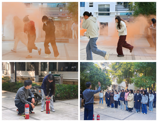 11月22日,宿舍消防逃生演习在四号寝室楼正式拉开帷幕。随着模拟火灾警报声的响起,演习迅速进入实战状态。同学们反应迅速,按照前期学习的逃生技巧,立即用湿毛巾紧紧捂住口鼻,弯腰低姿,沿着预定逃生路线快速、有序地撤离寝室。过程中,大家沉着冷静,不推挤、不慌乱,严格遵守逃生规范,短短几分钟内便全部安全抵达楼外指定安全区域。整场演习组织有序、流程规范,同学们展现出了极强的安全意识和良好的应急处置能力,圆满达成了预期目标。演习结束后,杨尚行老师现场为同学们开展了灭火器实操教学。他结合火灾案例,详细讲解了灭火器的 “提、拔、握、压” 四字使用口诀,重点强调了操作时的安全距离、喷射角度等关键注意事项,并现场演示了正确操作流程,让同学们直观掌握灭火器的使用要领,进一步补齐了 “初期火灾扑救” 的技能短板。