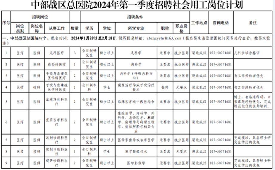 医院一季度拟招聘医疗、护理、药剂、工程、医技、工勤、行政管理、会计等岗位共47人,具体岗位信息请关注“中部战区总医院订阅号”进行查看,方式如下: