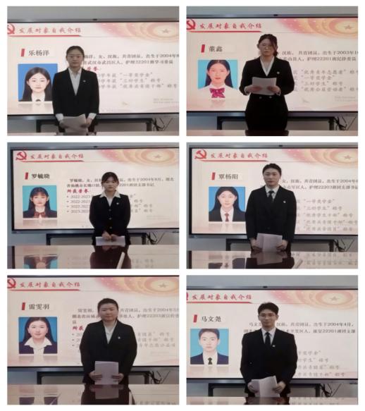 会议严格依据《中国共产党发展党员工作细则》党组织接收预备党员的程序进行。会议伊始,发展对象乐杨洋、董鑫、罗毓晓、覃杨阳、雷雯羽、马文尧等六名发展对象依次宣读了《入党志愿书》,并向党组织汇报自身对党的认识、入党动机、个人履历、家庭成员和主要社会关系、现实表现以及需向党组织说明的其他问题,表明自身对入党的坚定决心。