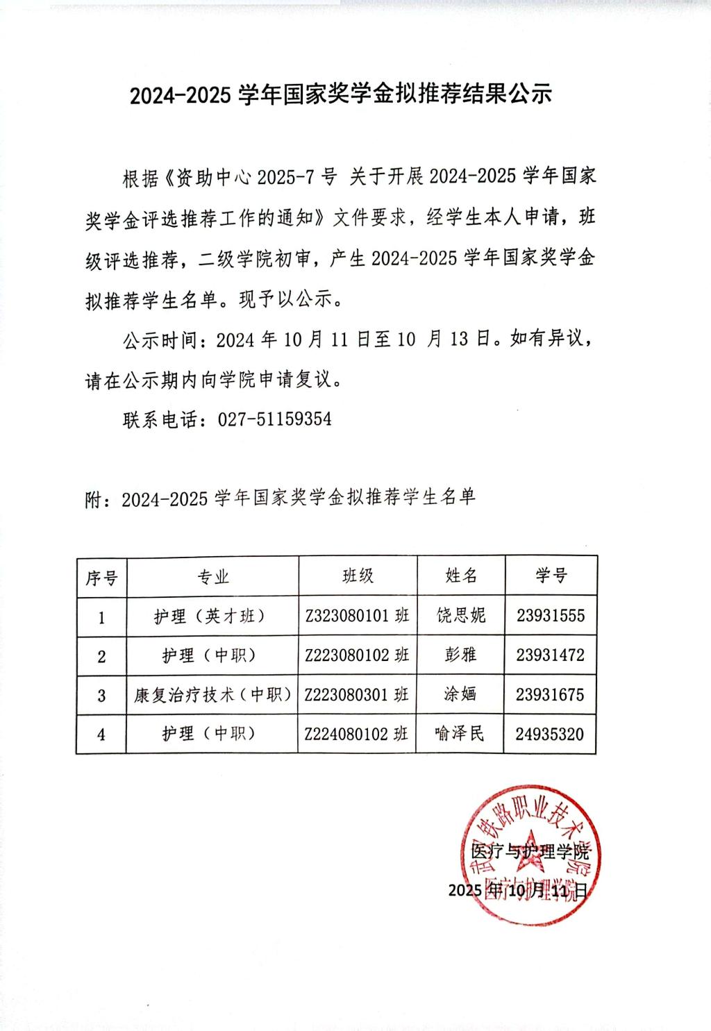 2024-2025学年国家奖学金拟推荐结果公示