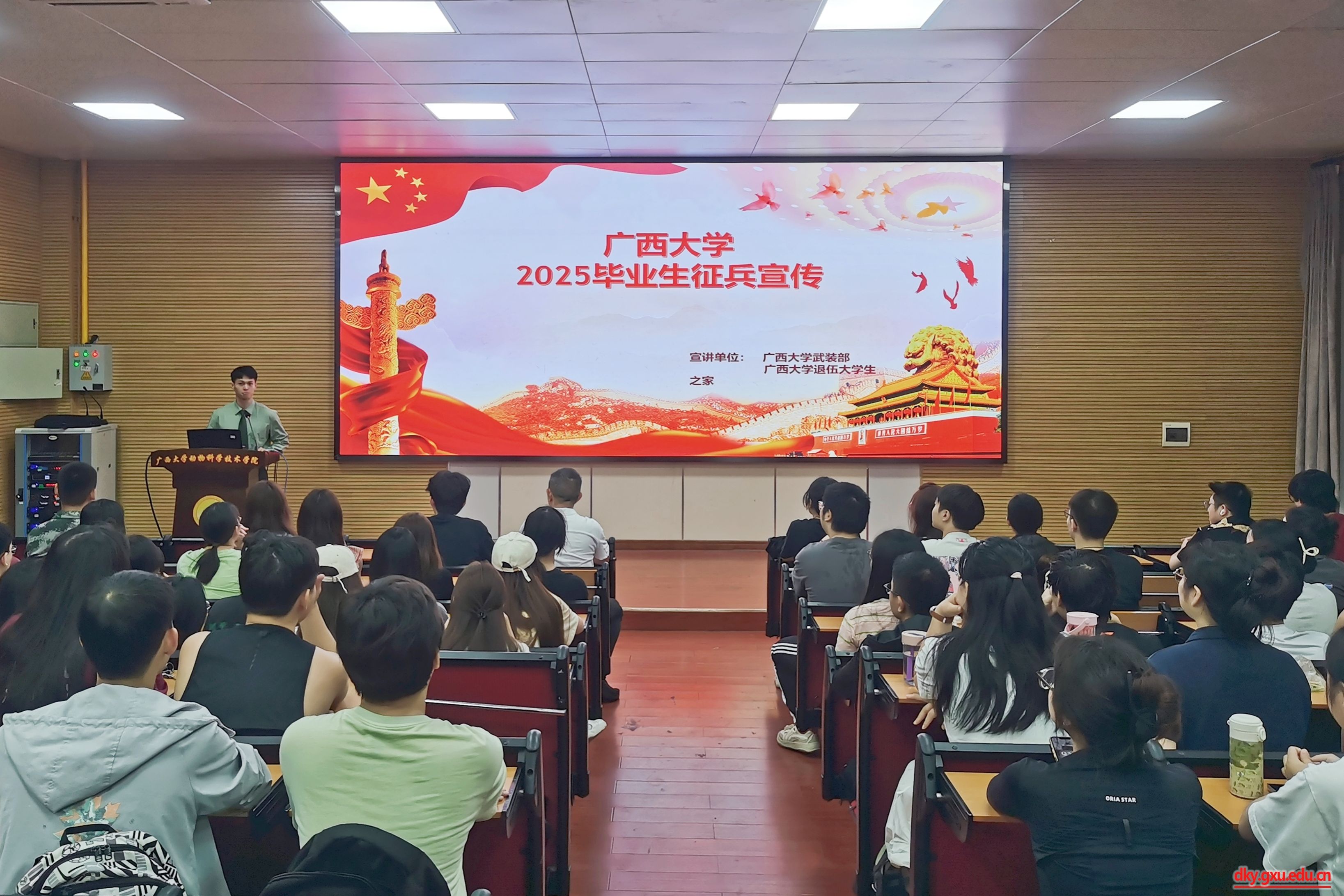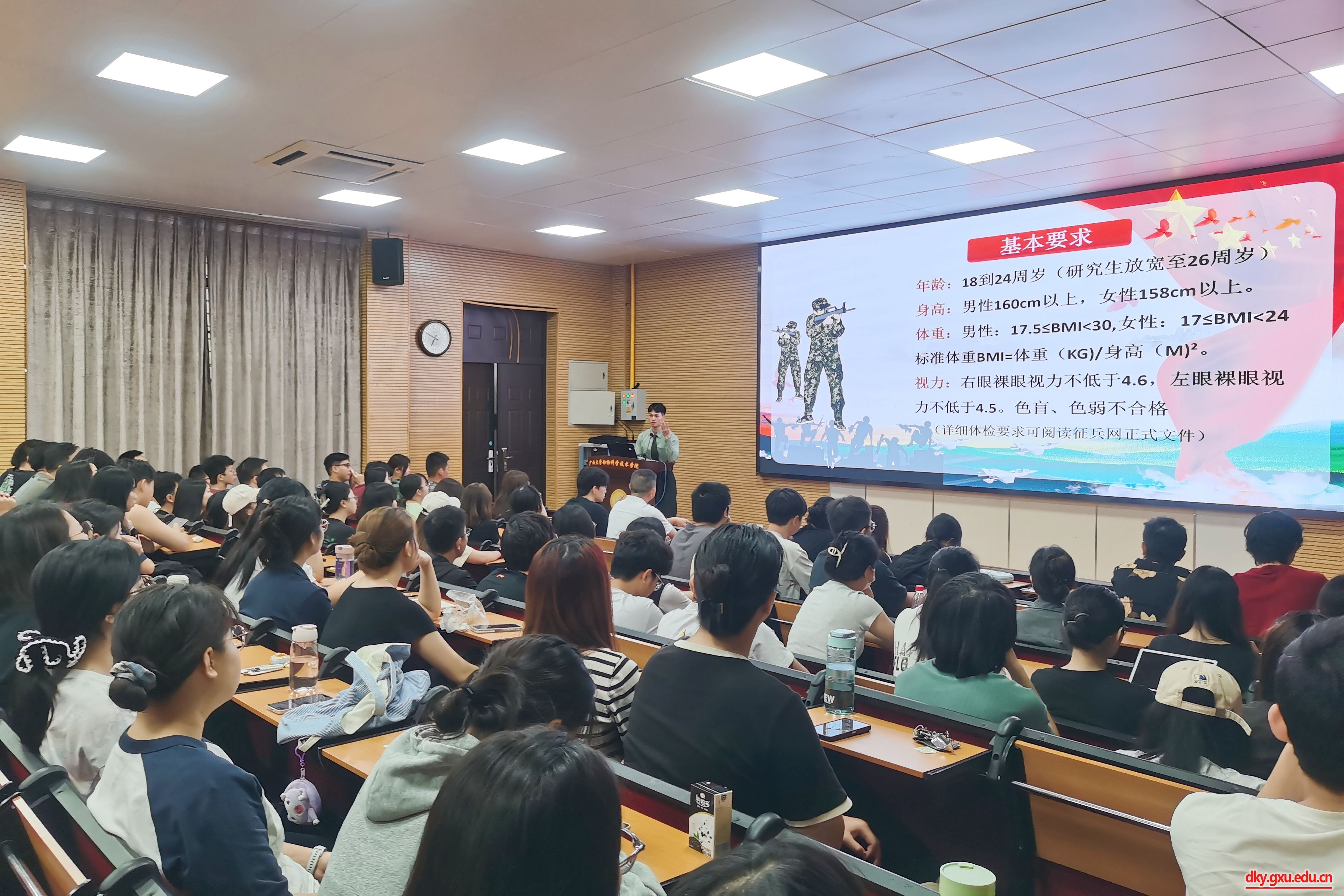 6月10日上午,广西大学yl23411永利集团官网在318报告厅举行2025年征兵动员会议,校武装部陈榕平和退伍大学生代表受邀到场为同学们详细讲解应征入伍政策。yl23411永利集团官网团委书记刘诚,辅导员陆维鸿和2025届毕业生参加此次会议。
